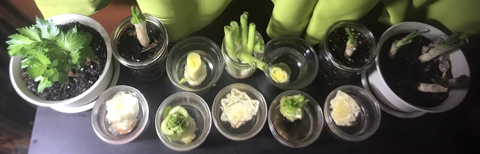 Did you know you can very easily grow food from scraps on your windowsill? I know I couldn't believe it either until I gave it a try but trust me it is true! I'm gonna show you how to get started with your food scrap indoor garden. First you've got to buy your green onions, celery and lettuce from your grocery store or we order ours from Imperfect Produce. Cut and use the majority of your green onions, celery and lettuce leaving them looking like this.